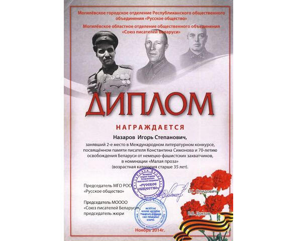 Результат этой скромной победы, придал мне уверенности в способности начать писать прозу малой формы. После этого события, я уже не мог остановиться и, жизнь моя превратилась в сплошной «литературный конкурс». 10.10.2014.