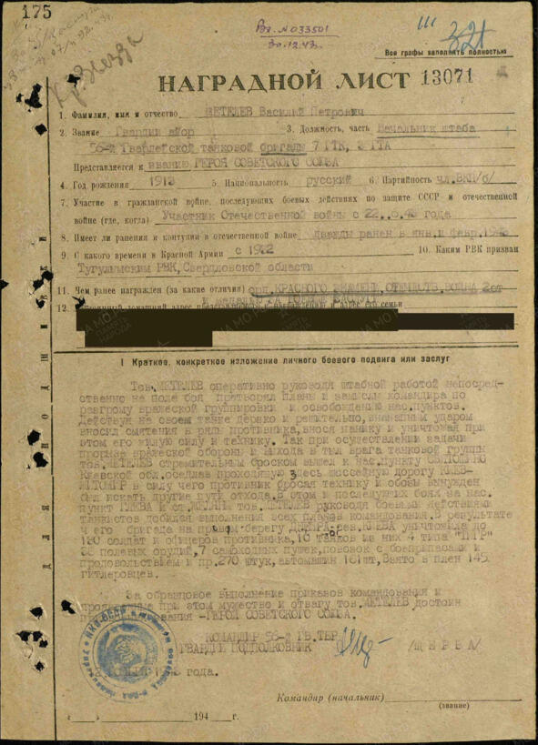 Тов. МЕТЕЛЕВ, оперативно руководил штабной работой непосредственно на поле боя, претворял планы и замыслы командира по разгрому вражеской группировки и освобождению населенных пунктов. Действуя на своем танке дерзко и решительно, внезапным ударом вносил смятение в ряды противника, внося панику и уничтожая при этом его живую силу и технику. Так, при осуществлении задачи прорыва вражеской обороны и выхода в тыл врага танковой группы, тов. Метелев стремительным броском вышел к населенному пункту Святошино Киевской области, оседлав проходящую здесь шоссейную дорогу Киев-Житомир, в силу чего противник, бросая технику и обозы, вынужден был искать другие пути отхода. В этом и последующих боях за населенный пункт Глева и ст. Желяны тов. Метелев, руководя боевыми действиями танкистов, добился выполнения всех планов командования. В результате чего бригада на правом берегу Днепра, севернее Киева, уничтожила до 130 солдат и офицеров противника, 10 танков, из них 4 «Тигра», 38 полевых орудий, 7 самоходных пушек, повозок с боеприпасами и продовольствием и пр., 270 пушек, автомашин 181 шт., взято в плен 145 гитлеровцев.