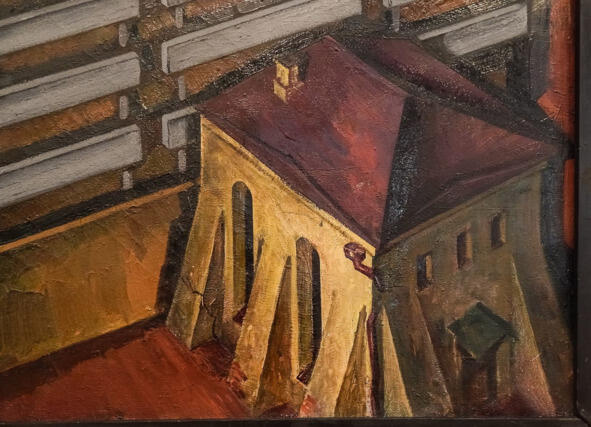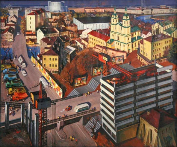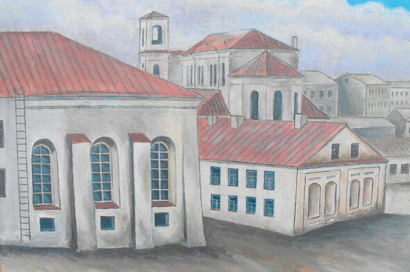 Данциг М. Мой город древний, молодой. 1972. х., м. «Холодная синагога. Об этой, казалось бы, невзрачной постройке сейчас остались лишь воспоминания минчан-старожилов, несколько плохоньких фотоснимков да знаменитая картина народного художника Беларуси Мая Данцига. На красочном и наполненном многочисленными любопытными деталями полотне 1972 года под говорящим названием Мой город древний, молодой в правом нижнем углу заметен желтоватый кубик под крышей цвета кармина, прилепившийся к строящейся стеклобетонной коробке института Белпромпроект. Обнесенному мощными контрфорсами домику на древней Немиге жить осталось совсем недолго, дни его в буквальном смысле сочтены, и в этом скрывается самое настоящее преступление. За скромным обликом старейшее здание Минска, единственный доставшийся ему памятник архитектуры XVI (!) века». Источник: https://realt.onliner.by/2014/06/11/los