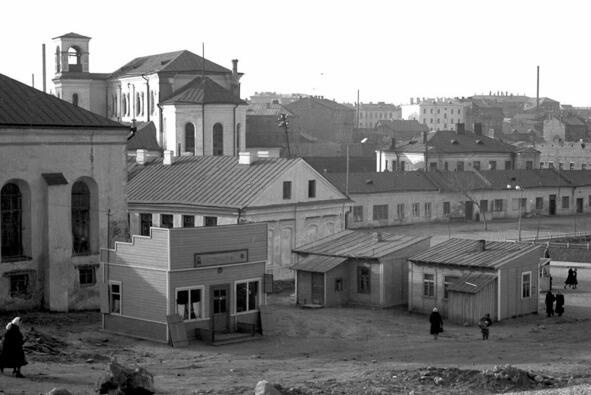 Рядом со зданием Белпромпроекта стояла синагога. Фото И. И. Бовта. Источник: https://minsk-old-new.com/places/hramy-i-religiya/sinagogi