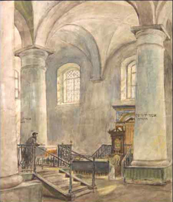 Внутренний вид Холодной синагоги. Кругер Я. Холодная синагога. Минск. 1921. акварель. Источник: http://present5.com/proshloe-nastoyashhee-i-budushhee-sinagog-belarusi-vystavka/ (https://minsk-old-new.com/places/hramy-i-religiya/sinagogi)