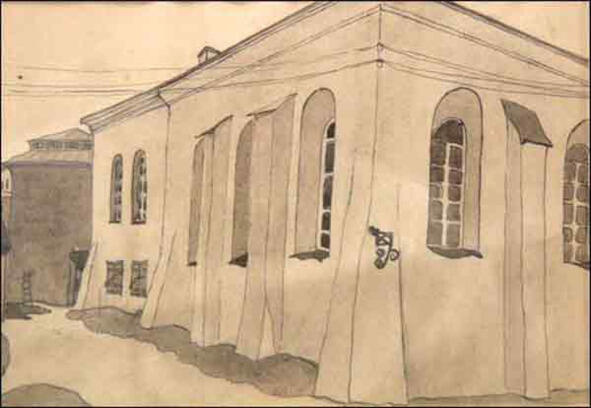 Филиппович М. Холодная синагога. 1924. акварель. Внешний вид Холодной синагоги. Источник: https://minsk-old-new.com/places/hramy-i-religiya/sinagogi