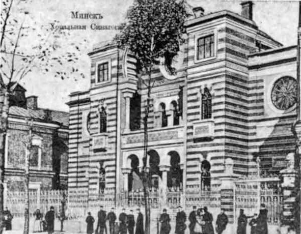 При создании Хоральной синагоги в Минске также прибегли к использованию мавританского стиля (как и при создании синагоги в Будапеште). Ее здание состояло из 2-х частей. Денис Мартинович пишет [6]: