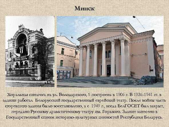 «Минск Хоральная синагога на ул. Володарского, 5 построена в 1906 г. В 1926 -1941 гг. в здании работал Белорусский государственный еврейский театр. После войны часть сгоревшего здания было восстановлено, а с 1949 г., когда Бел. ГОСЕТ был закрыт, передано Русскому драматическому театру им. Горького. Здание занесено в Государственный список историко-культурных ценностей Республики Беларусь». Источник: http://present5.com/proshloe-nastoyashhee-i-budushhee-sinagog-belarusi-vystavka/