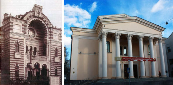 «А вот здание бывшей хоральной синагоги, теперь здесь размещается театр имени Горького или, как говорят, Русский театр. Но с обеих сторон здания можно увидеть, каким оно было до войны, «бел-чырвона-белым». http://belisrael.info/?tag=khoralnaya-sinagoga-v-minske
