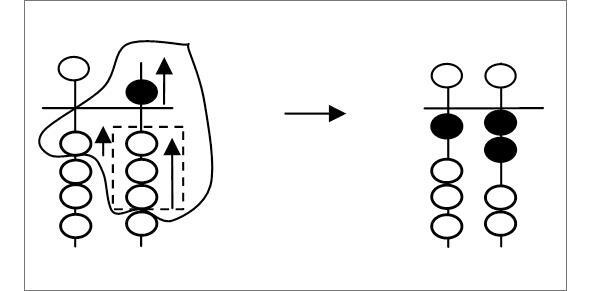 В первой части схемы набрано исходное число и вертикальными стрелочками обозначено движение косточек.