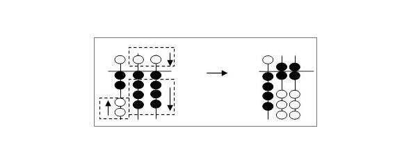 Правило: убираем 3 косточки земные на абакусе, добавляем одну небесную косточку (5).