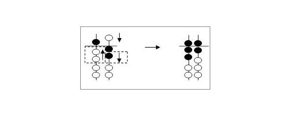 Суммируем единицы: 4+2. Косточек не хватает. Воспользуемся правилом: +2=3+5. Убираем 3 отложенные косточки и добавляем 1 небесную (5).
