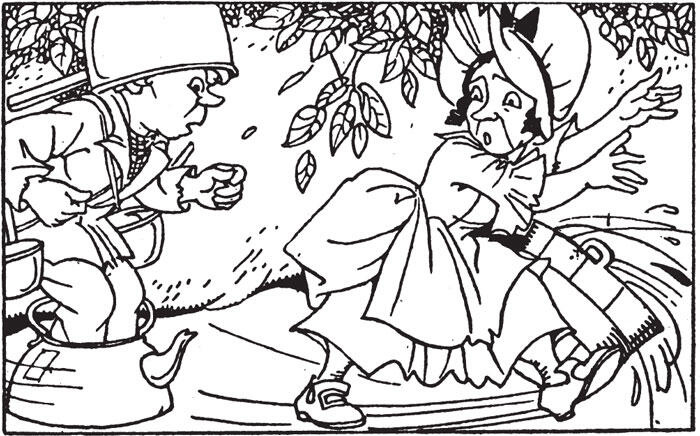 Увидев скачущего Кастрюльку, мадам Постирушка бросилась наутёк и опрокинула ушат воды.