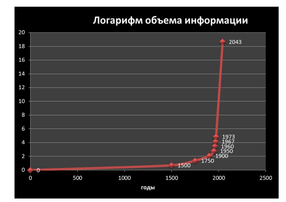 Искали Бога, шли к нему многие люди, великие и самые обыкновенные, например Лев Толстой, Достоевский, Сократ. Путь их был труден, опасен, долог. Теперь наступило другое время и путь этот значительно облегчился. Мы можем опереться на знания и опыт миллионов людей, скрытый ранее от нас барьерами расстояний, языков, образования, недоступностью книг, рукописей, намеренным сокрытием информации от непосвященных. В современном обществе объем доступной людям информации постоянно возрастает. Из чего это следует? Приведем кривую роста объема информации, генерируемой человечеством, построенную по данным французского экономиста Жоржа Андерля [39]. Кривая приводится в логарифмическом масштабе, с учетом прогнозных данных до 2043 года. Она поражает взрывным ростом.