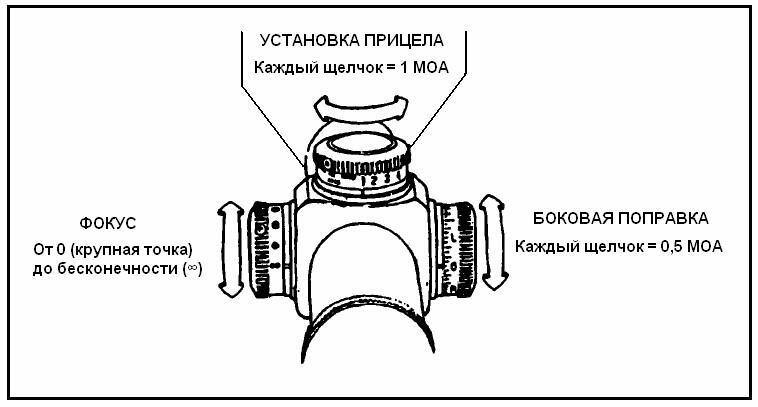 Рис. 2-18. Маловички установки прицела, регулировки фокуса и внесения боковых поправок.