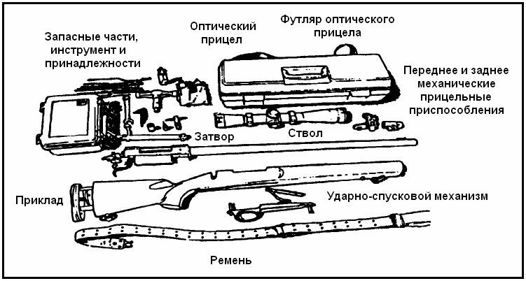 Система снайперского оружия М24 представляет собой 7,62-мм винтовку с продольноскользящим затвором и шестизарядным магазином (один патрон в патроннике, пять патронов в магазине). Она может использоваться как с оптическим прицелом М3А, так и с механическими прицельными приспособлениями. Снайпер обязан знать состав системы снайперского оружия М24 и порядок ее использования (рис. 2-1). Для проведения текущего обслуживания и ремонта, в состав системы входит комплект запасных частей, инструментов и принадлежностей (ЗИП) (рис. 2-2).