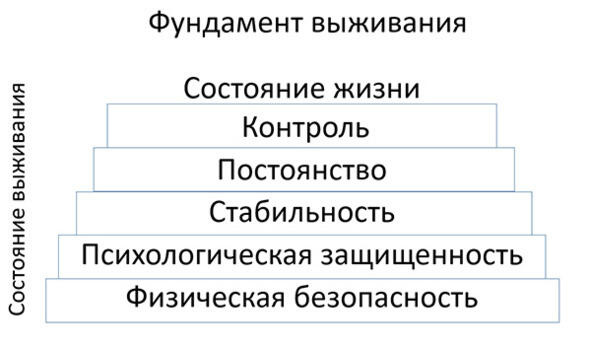 Пять вышеперечисленных пунктов составляют фундамент, обеспечив который, человек из состояния выживания переходит в состояние жизни, обретая ресурсы для творчества, развития и созидания. Становится важной не только сама деятельность и ее результаты, но и то, какой ценой они достаются, в каком состоянии души, с какой мотивацией и целью. На этапе выживания все эти факторы, как правило, не актуальны, поскольку у человека нет ни ресурсов, ни времени, ни осознанности.