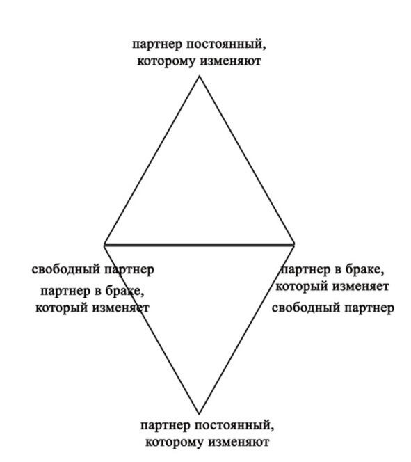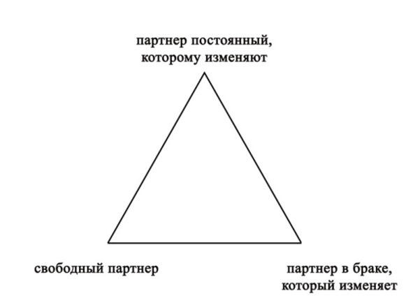 Мы рассматриваем вариант «классического» треугольника, т.е. отношения, в которых присутствует свободный партнер (любовник или любовница), партнер в браке (или стабильных достаточно длительных отношений) и партнер постоянный (основной), которому изменяют. Мы также предполагаем, что «побочные» отношения носят серьезный характер в них есть влюбленность, ожидания, надежды. Партнер, которому изменяют, узнает об измене.
