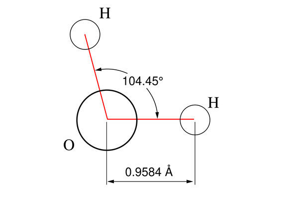 Говоря о химических и физических свойствам воды, важно сказать, что вода это бинарное неорганическое соединение имеющее формулу H2O. Состоит из двух атомов водорода и одного атома кислорода, при этом угол между двумя атомами водорода составляет 104,45 градусов в молекуле (Рис. 1.1), а расстояние от центра атома кислорода до центра атома водорода составит 0,9584 ангстрема. Обладает ковалентной связью и при нормальных условиях, то есть при давлении в 101 325 Па, что равно 1 бар, 760 мм рт. ст. или 1 атмосфере, стандартной температуре в 293,15 К, что равно 20 градусов по Целью и 52 градуса по Фаренгейту.