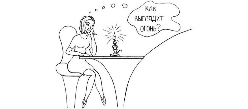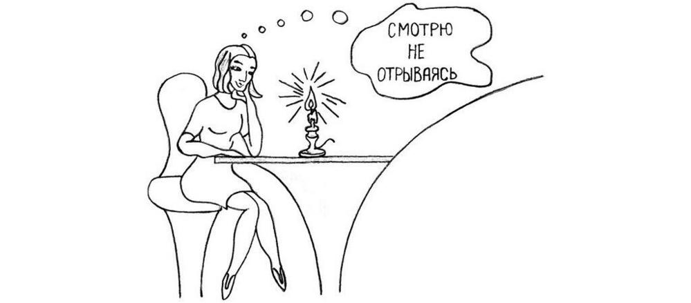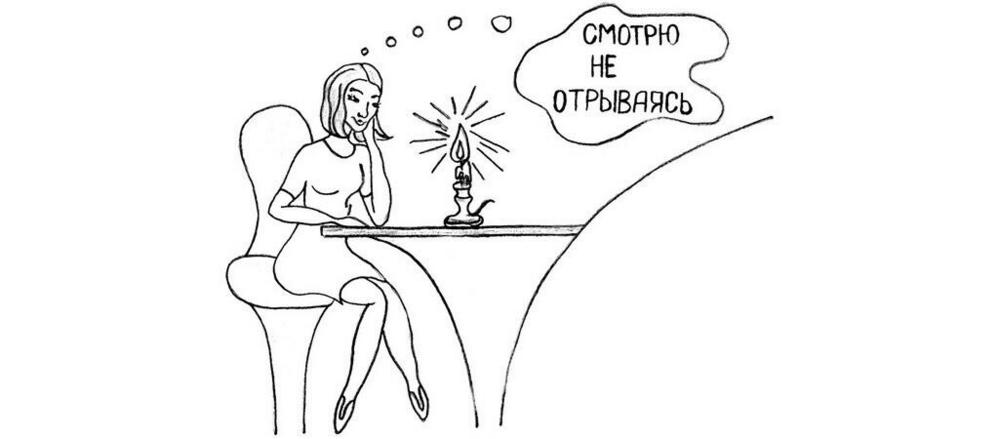 Ответь на простые вопросы: « Какова форма свечи и огня, ее цвет, запах, каково все, что попадает в ее поле зрения, фон на стене, подсвечник?». Сохраняй острое состояние ума, изучая Огонь в деталях, как будто видишь его первый раз в жизни, давая ему, как можно больше физических характеристик.