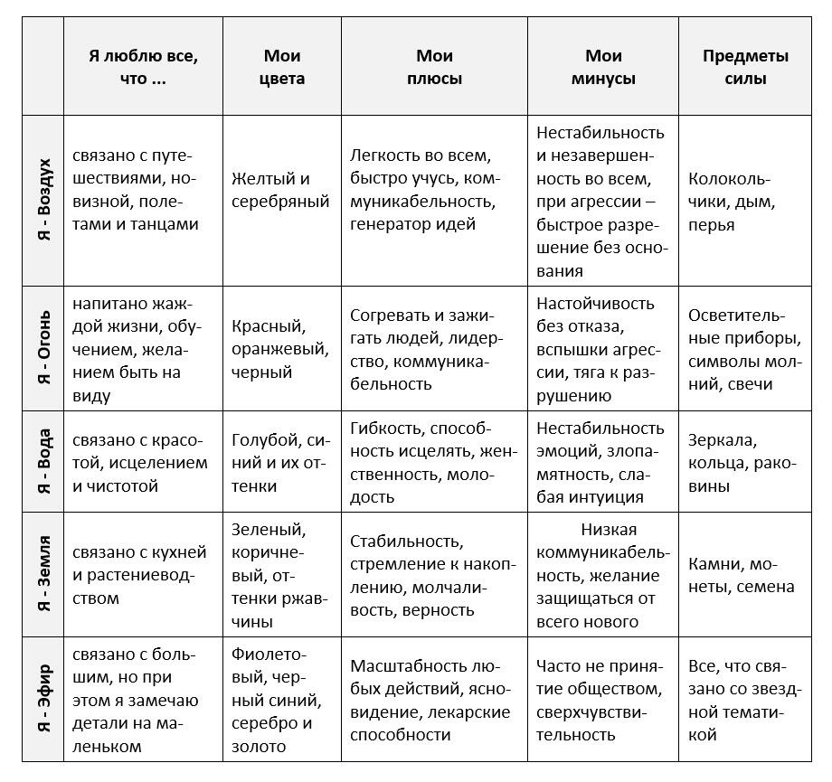 Второй способ заключается в слушании своего внутреннего отклика на описание особенностей разных стихий. Прочитай таблицу ниже, что тебе ближе всего к душе? Отмечай попадания плюсами. Посчитай в какой стихии их больше.