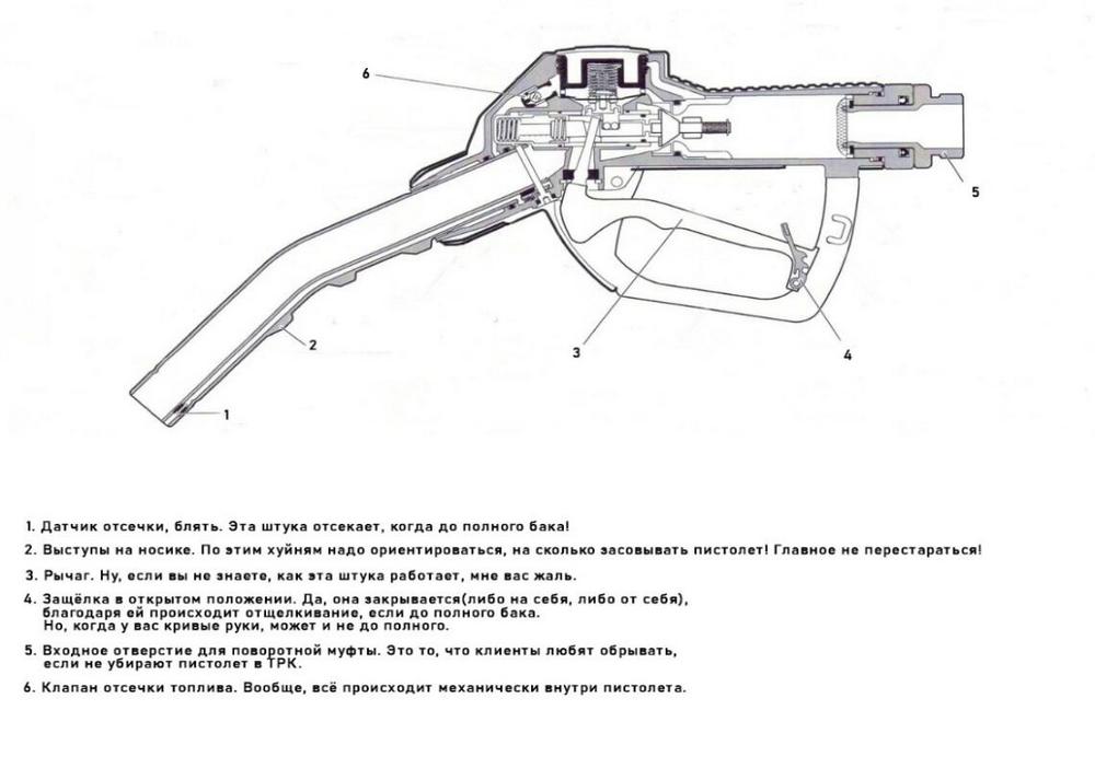 Если вы всё же решили произвести заправку самостоятельно, смотрите за напором в пистолете, ибо, когда пистолет зафиксирован на максимум, напор намного больше, чем на среднем фиксаторе. Внимание! Не надо пихать пистолет по самые яйца, вы не сексом с машиной занимаетесь будет выщёлкивать! Также не стоит не досовывать есть шанс вылета пистолета на асфальт! Я сделаю схему работы пистолета, чтобы было понятно, о чём пишу. Не надо включать в себе одноклеточного и говорить, что ваши пистолеты не отсекаются, всё работает, просто вы не умеете производить заправку! Когда пистолет точно не срабатывает, никто не ругается, а спокойно об этом сообщают оператору АЗС, он уже создаёт заявку, сообщает нужным людям и, либо закрывает нерабочий пистолет, либо предупреждает клиентов. Не надо выносить мозг оператору, он уже обо всём знает, не включайте «умников», вы не умеете это делать. Ваша задача просто следить, чтобы не произошло пролива бензина.