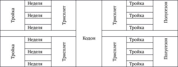 Тройка это три недели, пятнадцать дней. Планирование деятельности может осуществляться в поточном режиме, когда, вместо ограничивающих клеток для каждого дня, есть недельная полоса. В разрывах указывается день полусезона (сверху или снизу по удобству)