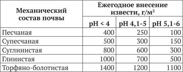 Раскисление почвыКислые почвы необходимо раскислять, для этого можно использовать известь. Ее требуется разное количество для почв разного механического состава и различной кислотности.