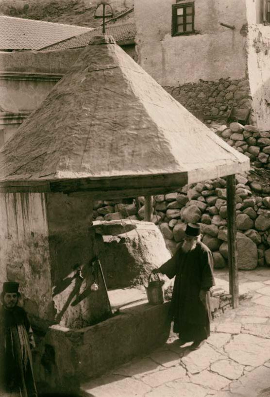 А в нескольких шагах от основания колокольни, под аркой колодец Моисея. Бежав из Египта и проделав в одиночку тот путь, по которому он потом поведет народ израильский, он пришел в землю Мадиамскую и сел у колодца, потому что в пустыне колодец это то место, где можно встретить людей. И Господь выслал ему навстречу семерых дочерей священника Мадиамского, пришедших напоить овец. Колодец еще тысячелетия на два древнее храма, и его глубинные подземные воды по трубам поступают в монастырь, напояя его, орошая и омывая, как ветхозаветные глубины питают тексты и образы Нового Завета.