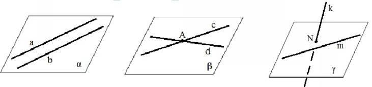 В первом случае Отрезки a и b параллельны и находятся в плоскости α. Во втором случае Отрезки c и d пересекаются и в пересечении рождают Точку А и находятся в плоскости β. В третьем случае Отрезки k и m скрещиваются. Отрезок m лежит в плоскости γ, а Отрезок k пересекает плоскость γ и рождает Точку N.