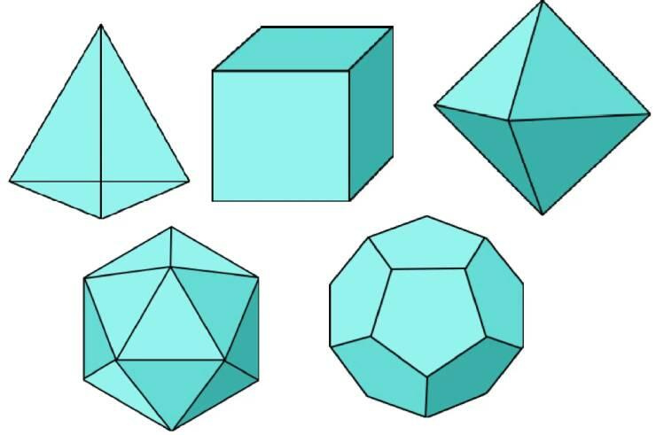 Первую фигуру назвали тетраэдром, вторую кубом, третью октаэдром, четвертую икосаэдром и пятую додекаэдром. Это правильные многогранники, потому что у каждого этого многогранника одинаковые ребра и грани. А внутри них пустота, потому что они образованы из Плиток. Вскоре появились и неправильные трехмерные тела из пересечения Плиток: пирамиды, параллелепипеды, призмы и т.д.