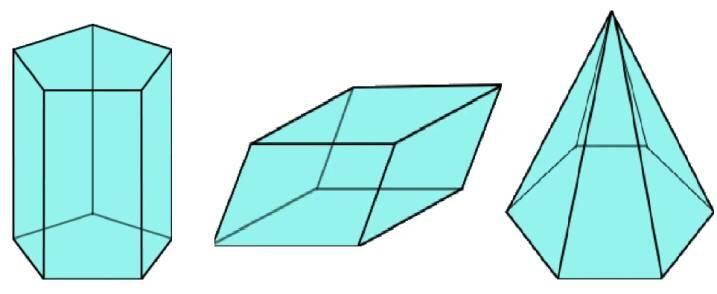У призмы нижнее и верхнее основания многоугольники, которые одинаковы и параллельны, а боковые грани являются параллелограммами. У параллелепипеда все грани являются параллелограммами. Параллеллограмм это четырехугольник, у которого противоположные стороны равны и параллельны. У пирамиды в основании лежит многоугольник, а боковые грани являются треугольниками с общей вершиной, называемой вершиной пирамиды.