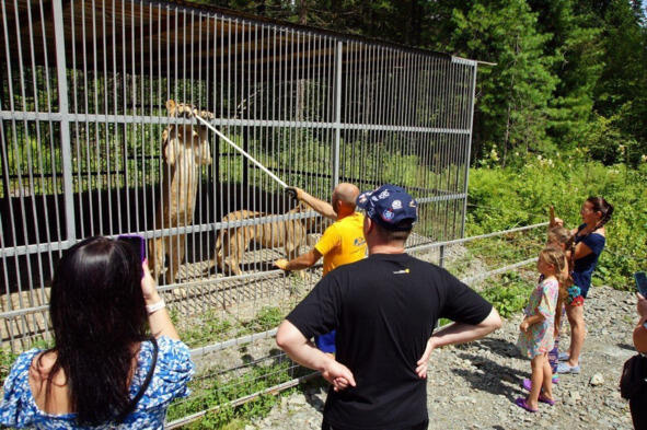 Медведица Глаша оказалась куда спокойнее леопарда. Тот бешено рычал, хлестал хвостом, кидался на решетку и добился-таки, чтобы кусок куриной тушки ему просто бросили в клетку. А медведице кормилец подсовывал-подсовывал мясо на кончике пики в уголок, под потолок клетки, и все же заставил ее залезть по прутьям и снять мясо на радость столпившимся вокруг детишкам. Они восторженно бегали вслед за работником артыбашского зоопарка, раздававшего хищникам мясо, носухам бананы, страусам уж не помню, что именно.