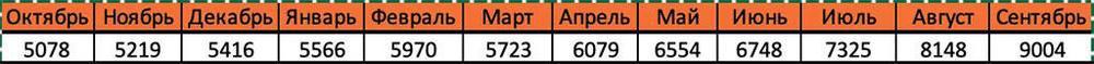 Выше мы видим таблицу, где я взял стоимость FXIT на начало каждого месяца начиная с октября 2019 года и заканчивая сентябрем 2020 года. То есть 1 октября 2019 года мы купили одну штуку за 5078 рублей. 1 ноября 2019 года мы купили эту же акцию за 5219 и т. д. Мы просто в начале каждого месяца на протяжении года покупали по одной акции данного ETF. Таким образом, через год мы суммарно потратили на покупку этих акций 76 830 рублей. Последняя покупка будет совершена нами 1 сентября 2020 года на сумму 9004 рубля.