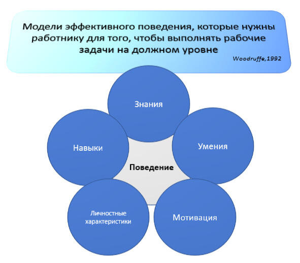 В 1992 году Woodruffe сформулировал одно из довольно удачных определений компетенции. Согласно его формулировке, «компетенции это модели эффективного поведения, которые нужны работнику для того, чтобы выполнять рабочие задачи на должном уровне». А модели поведения не существуют сами по себе, а являются продуктом знаний человека, его умений, навыков, мотивации (!) и личностных характеристик.