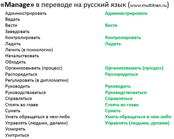Для этого я воспользовался одним из лучших онлайн-словарей современности (www.multitran.ru) и выписал большинство русских значений слова «manage» [2] (левый столбик, в алфавитном порядке). Получилось вот что: