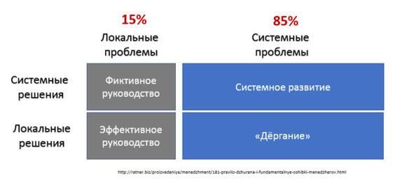 А если системные проблемы (которых 85%) решают SLM или другие Топ-менеджеры с помощью системных решений, то проблемы, как правило, решаются, а организация получает системное развитие. Но в том случае, если системные проблемы начинают решать менеджеры первой линии (FLM) своими локальными решениями, получается только «дёргание».