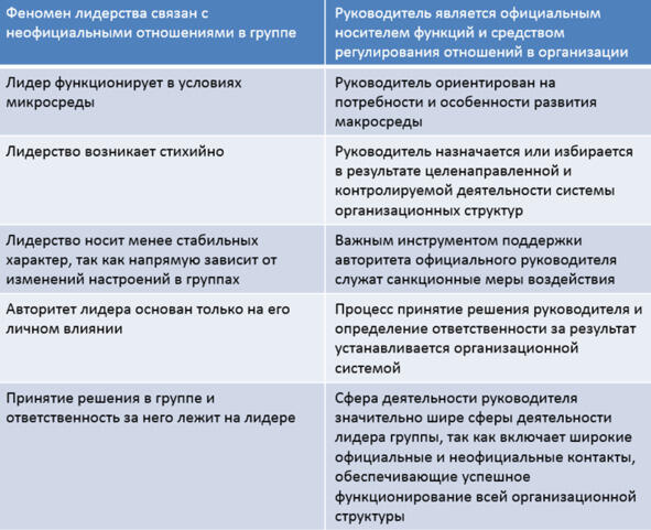 Для того, чтобы не возникало путаницы между лидерством и руководством, привожу таблицу, в которой указаны основные отличия между этими двумя понятиями («Отличительные особенности лидера и руководителя» (по Б. Д. Парыкину).