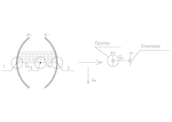 Для дальнейших рассуждений надо пояснить, что каждое из энергетических состояний пространства дискретно и непрерывно одновременно. Это говорит о том, что оно состоит из множества определенных дискретных значений, которые связаны в непрерывную линию. Предположим, что одно минимальное дискретное значение минусового состояния это электрон (е-), а плюсового состояния позитрон (е+). При этом между каждой парой электрон позитрон существует перегородка в виде нейтрино (ʋе) и антинейтрино (ΰе). Антинейтрино больше, чем нейтрино.