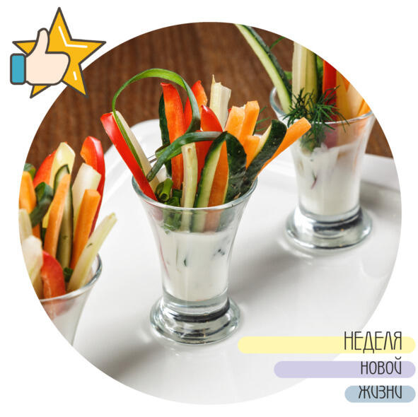 Укроп мелко рубим и смешиваем с йогуртом. Перец сладкий (можно разных цветов), огурец, морковь, стебель сельдерея нарезаем брусками длиной 78 см. В коктейльную рюмку наливаем йогурт с укропом на 2/3 от объема рюмки, затем аккуратно в любом порядке вставляем овощи. Украшаем веточкой укропа и зеленым луком.