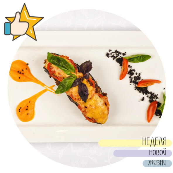 Баклажан нарезаем пластинами 24 мм, помещаем в подсоленную воду на 30 минут. Запекаем баклажаны 15 минут при температуре 100°С.