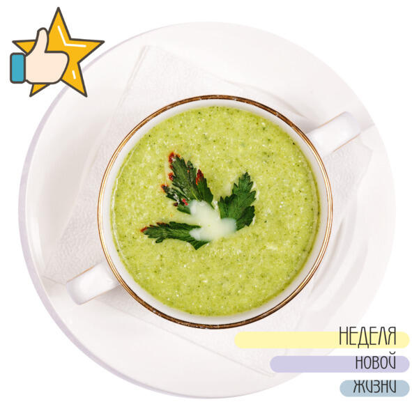В овощной отвар добавляем пюре брокколи, белый соус, соль, сливки, доводим до кипения и заправляем молочно-яичной смесью. При подаче добавляем сливочное масло и украшаем зеленью петрушки и веточкой укропа.