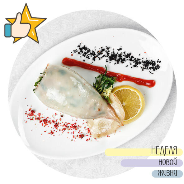 Тушку кальмара, очищенную и промытую фаршируем начинкой из риса, бекона и зелени и готовим в предварительно разогретой до 200 С духовке 5 минут. При подаче украшаем лимоном и томатным соусом.