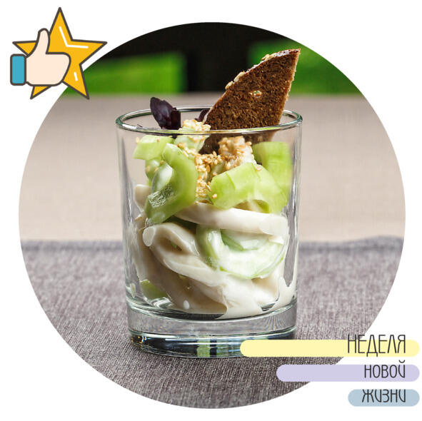 Огурец очищаем от кожицы, разрезаем пополам, удаляем сердцевину и нарезаем полукольцами. Тушку кальмара заливаем кипятком и варим 23 минуты, затем охлаждаем и нарезаем соломкой. Все ингредиенты смешиваем, заправляем соусом из йогурта и кунжутного масла. При подаче украшаем семенами кунжута, обжаренного до золотистого цвета на сухой сковороде.