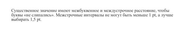 Существенное значение имеют межбуквенное и междустрочное расстояние, чтобы предложения и буквы «не слипались». Межстрочные интервалы не могут быть меньше 20 pt, а лучше выбирать 30 pt.