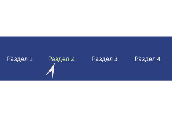 Цвет плашки меню может совпадать с основным цветом страницы, в этом случае в меню будет видно только название разделов. Для меню стоит подобрать два цвета шрифта, один из них будет отображаться при наведении курсора на название раздела.