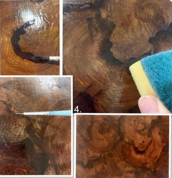 Четвертый слой краски умбра жженая+сажа газовая (черная краска) +вода. Нанести круглой тонкой кистью длинные линии, имитирующие темные участки дерева, прокручивая кисть и поворачивая ее в разные стороны. Очень толстые линии подтереть кисточкой или влажной салфеткой. Губкой «почпокать» поверх линий в некоторых местах. Тонкой кистью добавить извилистых линий, имитирующих рисунок дерева. Поставить точки черной краской в некоторых местах. Просушить. Нанести 23 слоя глянцевого акрилового лака. Последний слой матовый лак. (Рис. 1.4. поз.4).