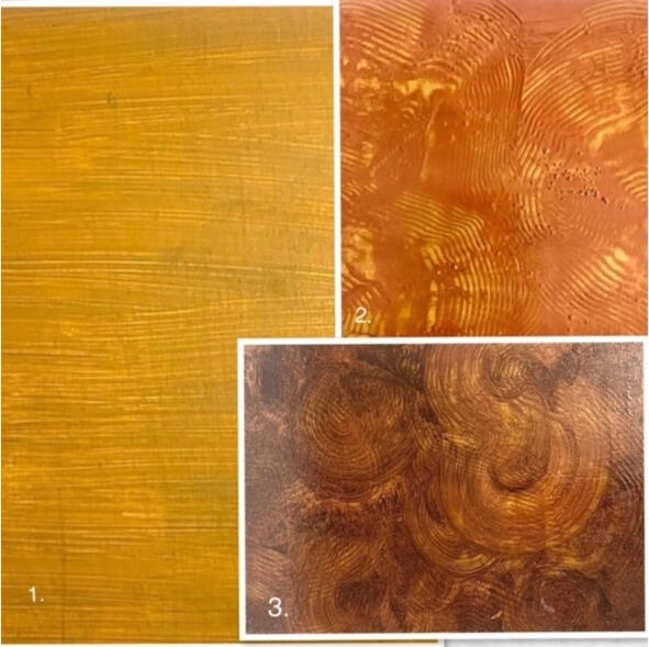 Третий слой краски умбра жженая+сиенна жженая+черная+вода. Нанести широкой кистью жидкую краску и зубчатым шпателем прорисовать волнообразные хаотичные линии, тем самым обнажая предыдущий слой. Лак 23 слоя. Просушить. (Рис. 1.3. поз.3).