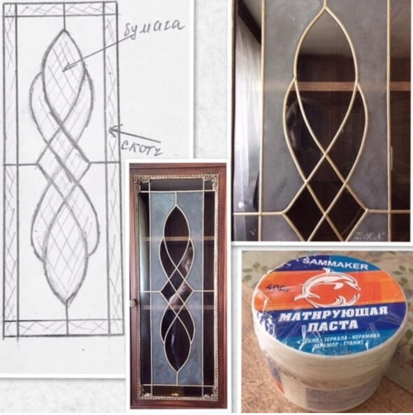 3. Нанести пасту для матирования стекла на нужные участки жирным слоем, без пропусков и проплешин, не экономить, она многоразовая. Через 1520 мин счистить пасту шпателем обратно в баночку, то, что осталось смыть водой губкой или мокрой тряпочкой, снять скотч. Вытереть насухо. Работать с пастой только в перчатках. Основа этих паст кислота.