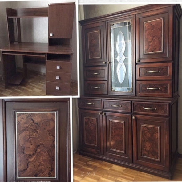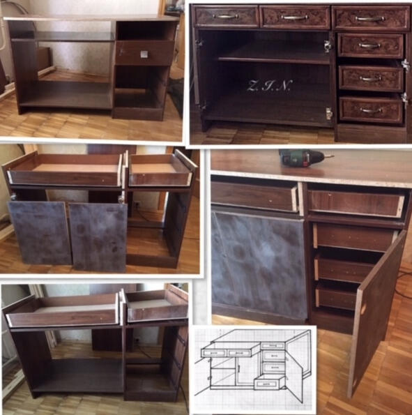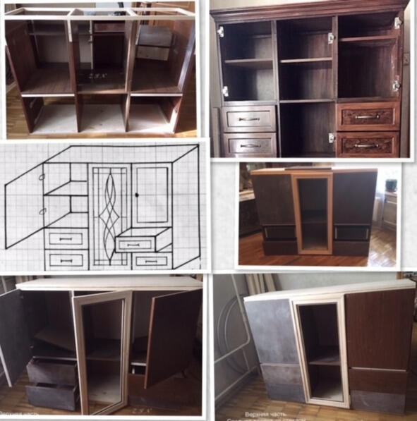 Рис. 3.4. Старый компьютерный стол (в левом верхнем углу), буфет, изготовленный на его основе (справа) и фрагмент отделки (в левом нижнем углу).