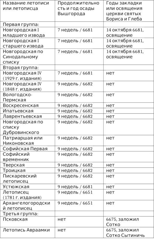 В меньшем числе источников 4 из 22 осада Вышгорода помечена 6681 г. При этом сказано, что она продолжалась не 9, а 7 недель. Так в Новгородской первой летописи старшего извода сказано: «В лето 6681. Иде князь Гюрги Андреевиць съ новгородьцы и съ ростовици Кыеву на Ростиславице и прогнаше е ис Кыева и стояше подъ Вышегородъмъ 7 недель и приидоша сторова вси Новугороду; а Ярославъ седе Кыеве Изяславицъ» (12). В Новгородской первой летописи младшего извода книжник также пишет о семинедельной осаде и при этом счел важным уточнить: «И приидоша в Новъгородъ вси здрави» (13). Близкое сообщение встречается в Летописи по Синодальному списку (14), а также в изданной в 1929 г. Новгородской четвертой летописи по списку Н. К. Никольского (15). Однако в более раннем издании этой же летописи, увидевшем свет в 1848 г., срок осады указан более продолжительным: «Стоя у Вышегорода недель 9, и не хоте кровопролития, възвартися восвояси» (16).