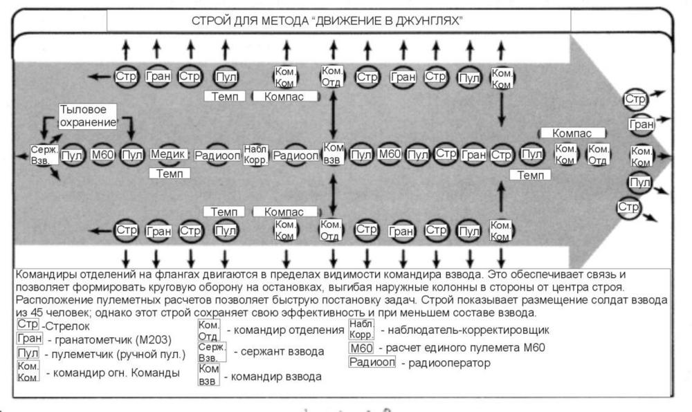 При использовании метода «передвижение с наблюдением» передовой элемент выполняет функции передового охранения, а остальная часть группы флангового и тылового. Когда контакт неизбежен, группа двигается методом ограниченного передвижения с наблюдением. Дистанция между элементом прикрытия и маневрирующим элементом зависит от ландшафта, но обычно не превышает 50 метров.