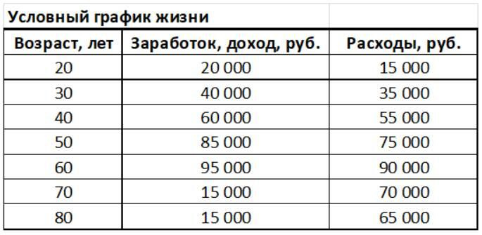 Знаете, сколько составляет среднестатистическая пенсия в России? Я подскажу: около 15 тыс. руб. в месяц (данные на 2020г). Вам этого хватит на жизнь, к которой вы привыкли? Предположим, вы живете разумно, рационально расходуя свои средства, но ничего не откладываете на старость. Посмотрите, как это выглядит на цифрах условного примера.