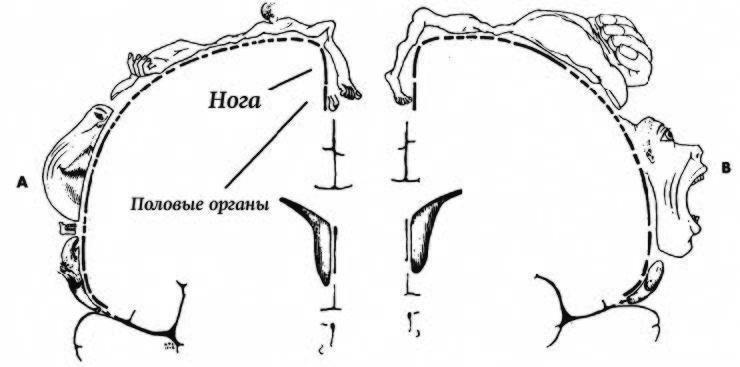 Гомункулус (человечек): схема, основанная в том числе и на исследованиях Уайлдера Пенфилда, дает представление о репрезентации той или иной части тела в соматосенсорной (A, слева) и моторной (B, справа) коре больших полушарий мозга. На представленном рисунке величина участка коры, который в ходе развития отводится для определенной части тела, отражает либо чувствительность этой части тела (слева), либо уровень ее двигательной функции (справа). Заметьте, что участок чувствительности в гениталиях лежит как раз под участком чувствительности в стопе. Обратите также внимание на обширное представительство чувствительности губ (слева) и моторики лицевых мышц (справа).
